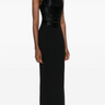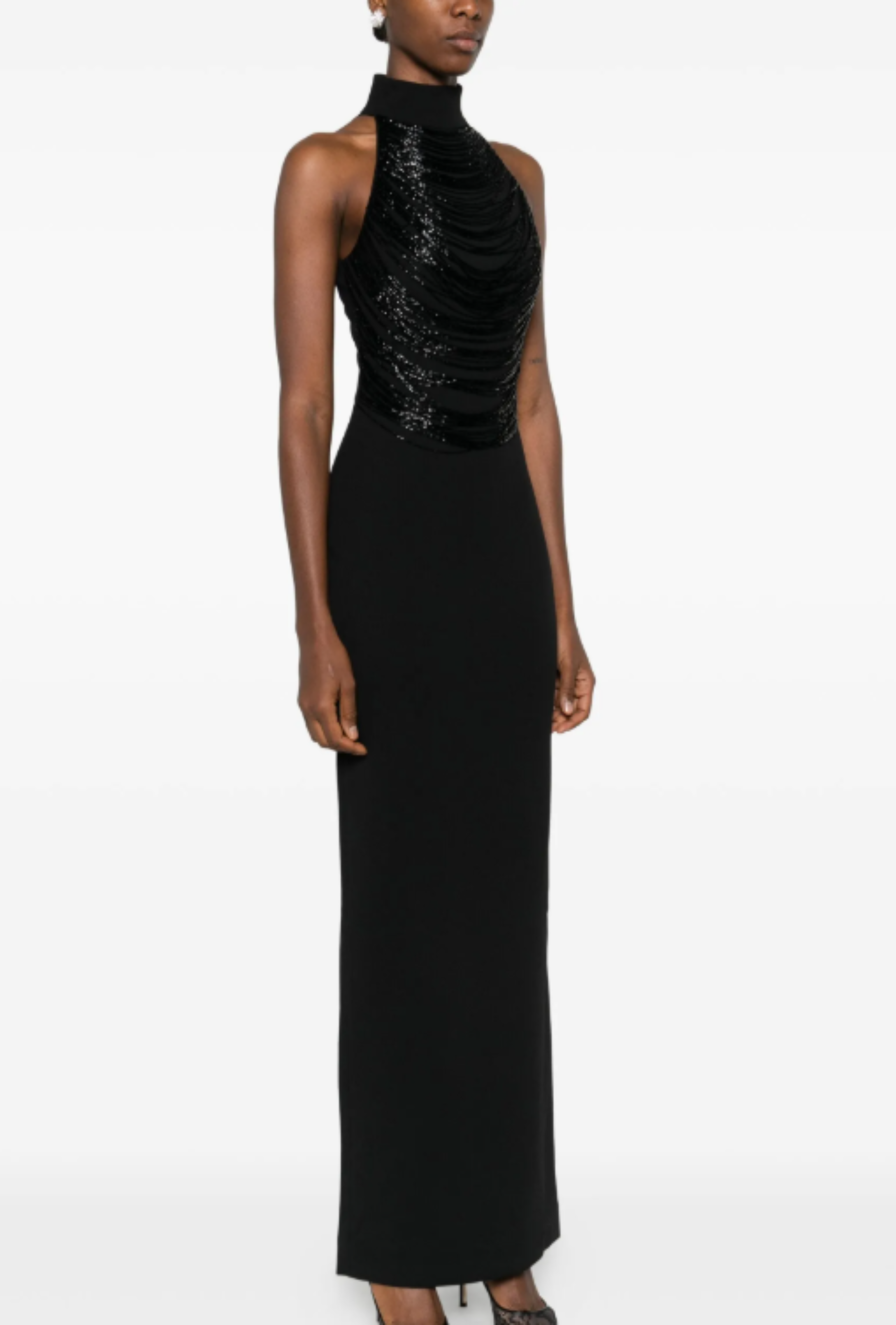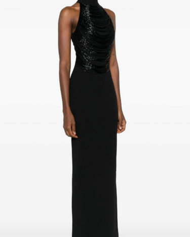 Made a stretch-crepe material and embellished detail, this dress is perfect for your next winter wedding or evening event!