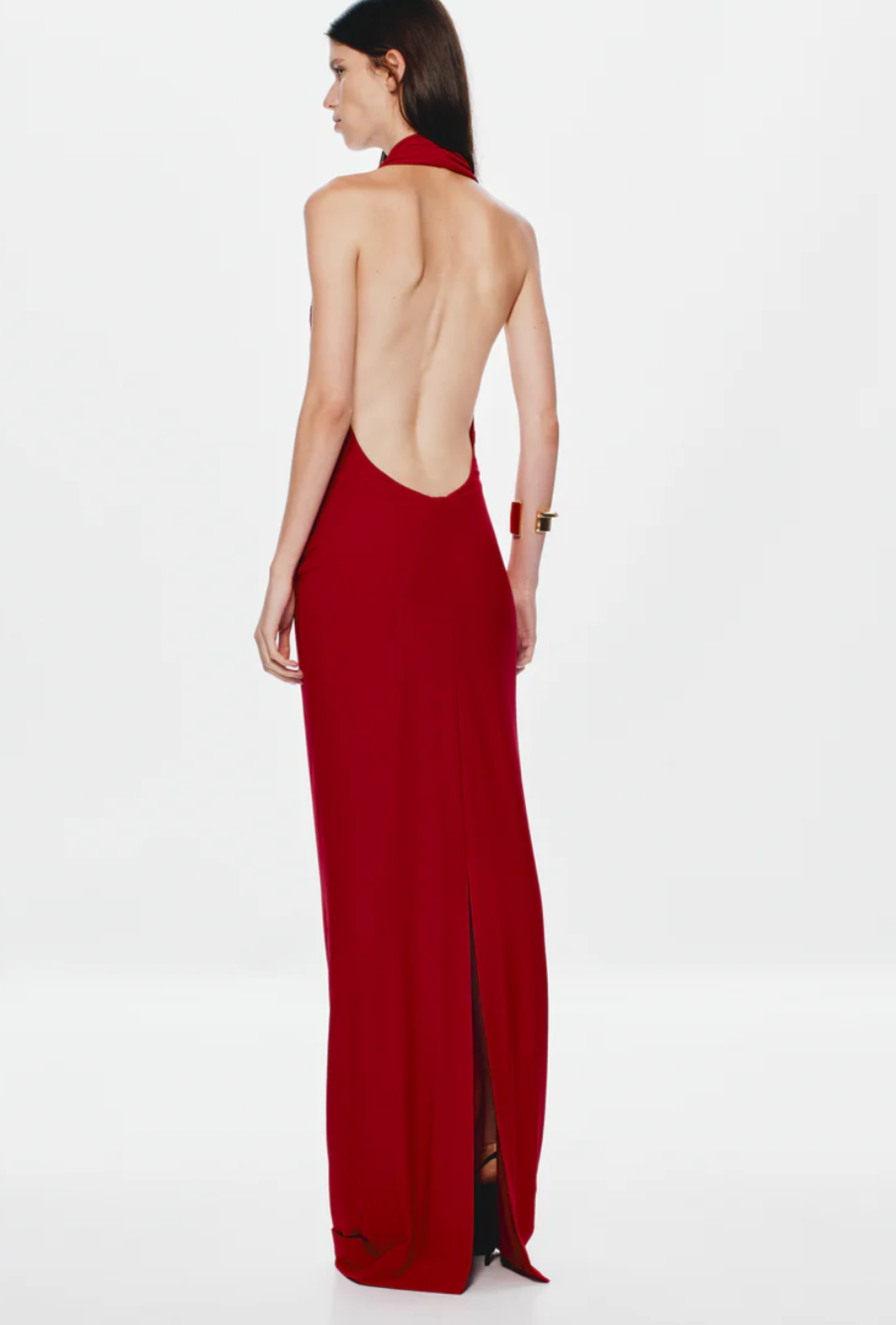 This halter-neck dress with a plunge cowl neckline is the perfect ball gown!