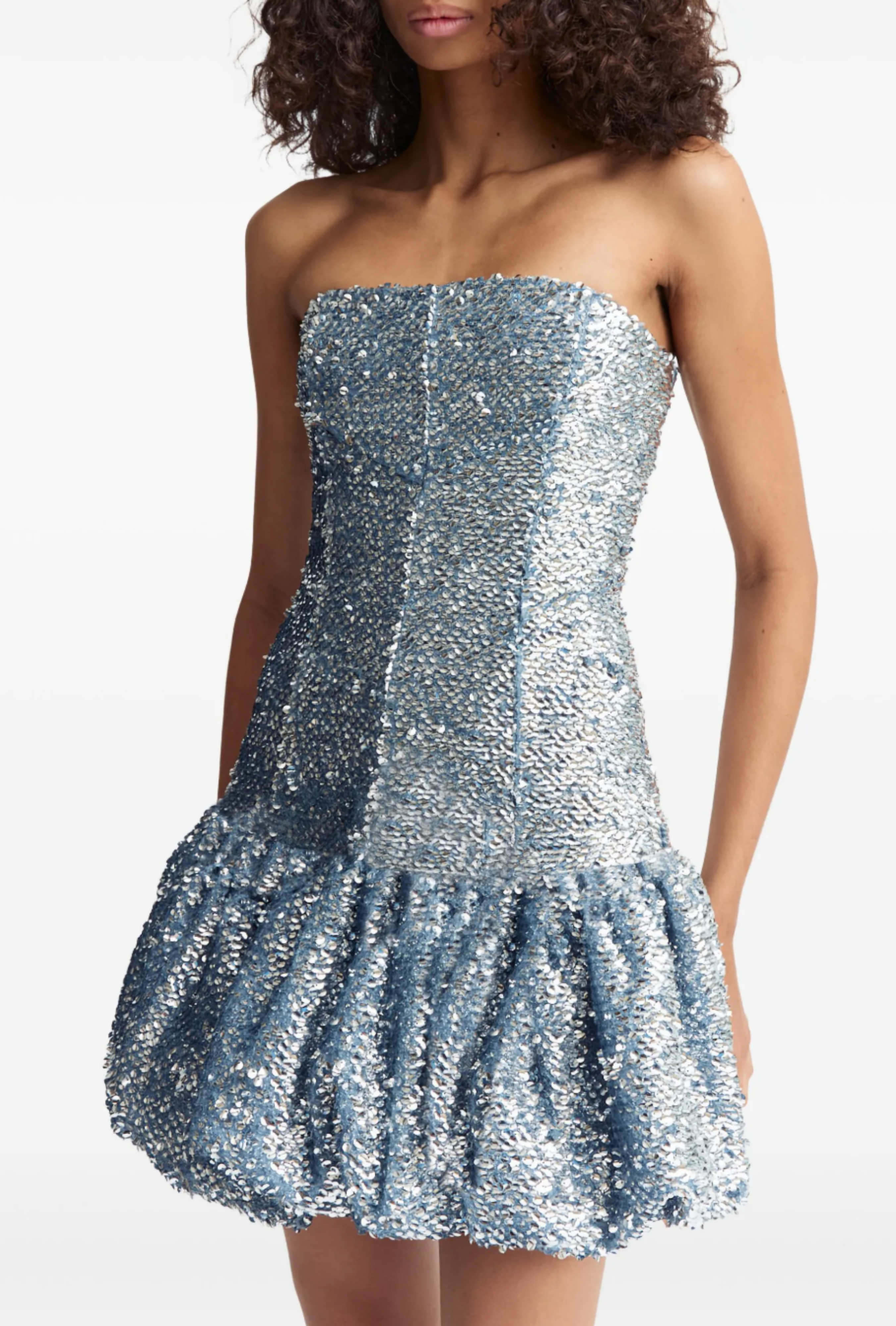 The Garance mini has a bubble peplum skirt and textured sequin fabric making it the perfect party dress!
